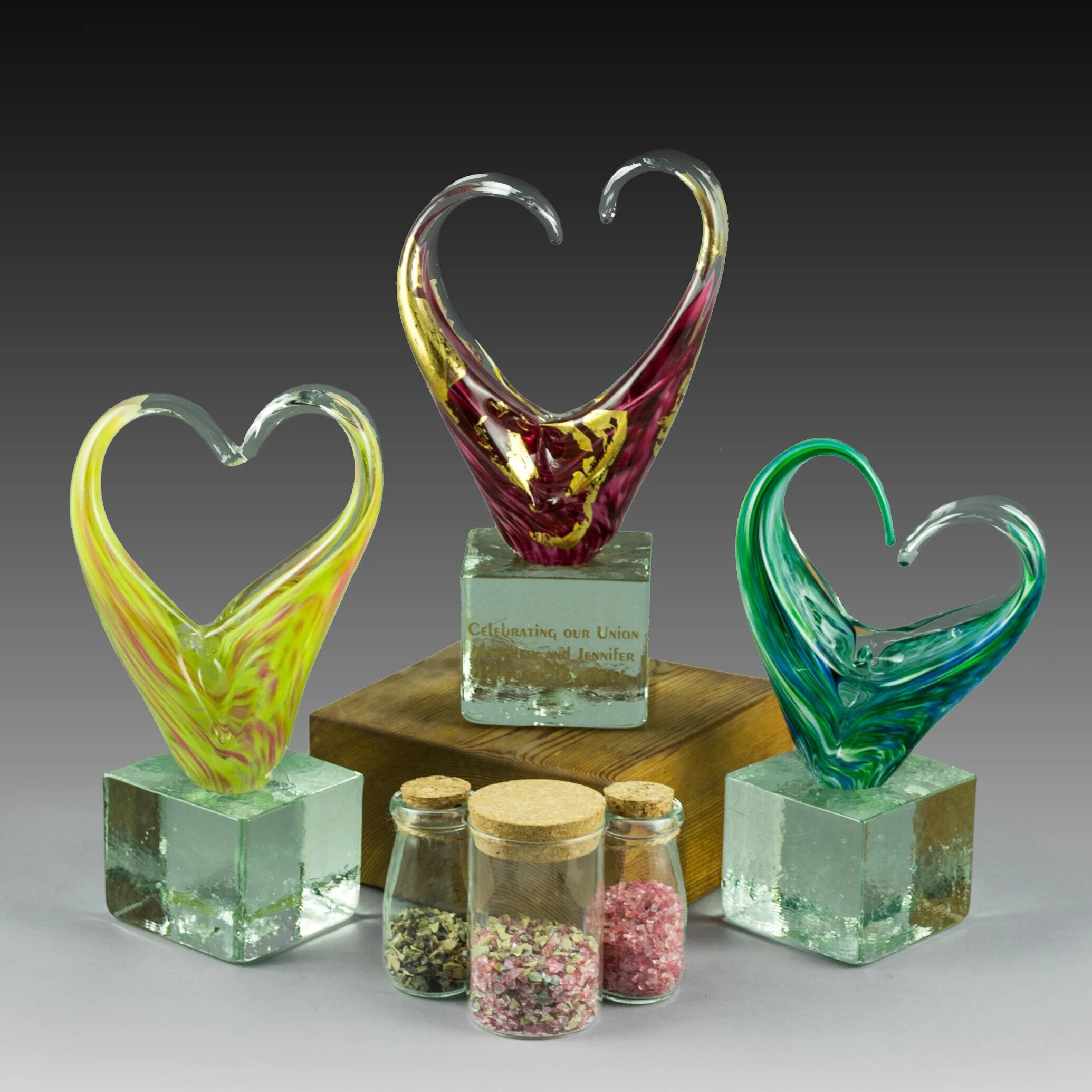 The unity heart sculpture is an organic heart shape incorporating the sand ceremony color and set on a heavy clear glass base with ample space for engraving.